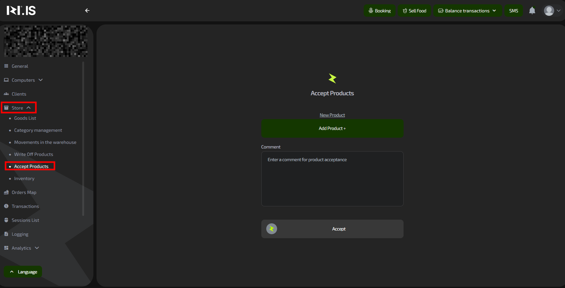 - You have access rights to manage the store (product creation, receiving, write-off)