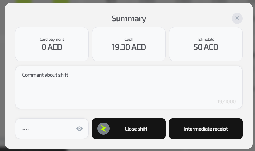 The total shift revenue is displayed, split by payment method: cash, cashless payments and the IZI.Play mobile app.