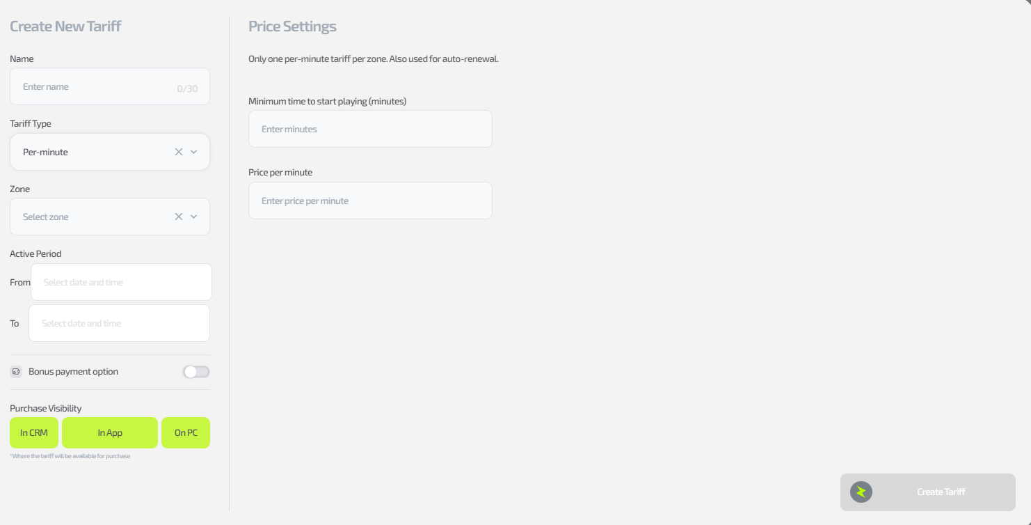 - tariff visibility (where the tariff will be available for purchase — CRM, app, PC).