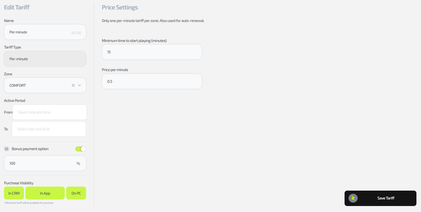 ⚠️ Reminder: only one per-minute tariff can exist per zone, and it is used for auto extension.