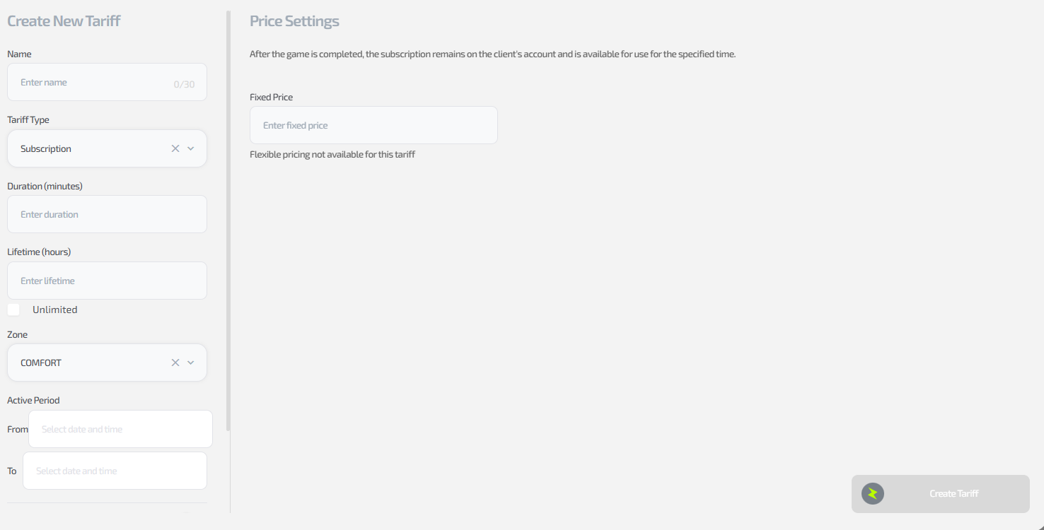 Click the “+ New tariff” button in the top right corner or “+” in the “Subscriptions” subsection of the required group.