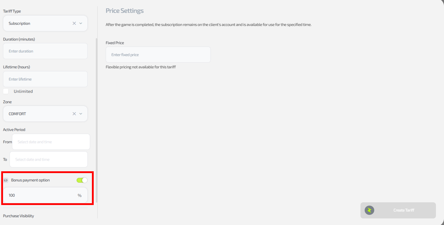- ability to pay for the tariff with bonuses. Enable this option and set what percentage of bonuses can be used to pay for this tariff;