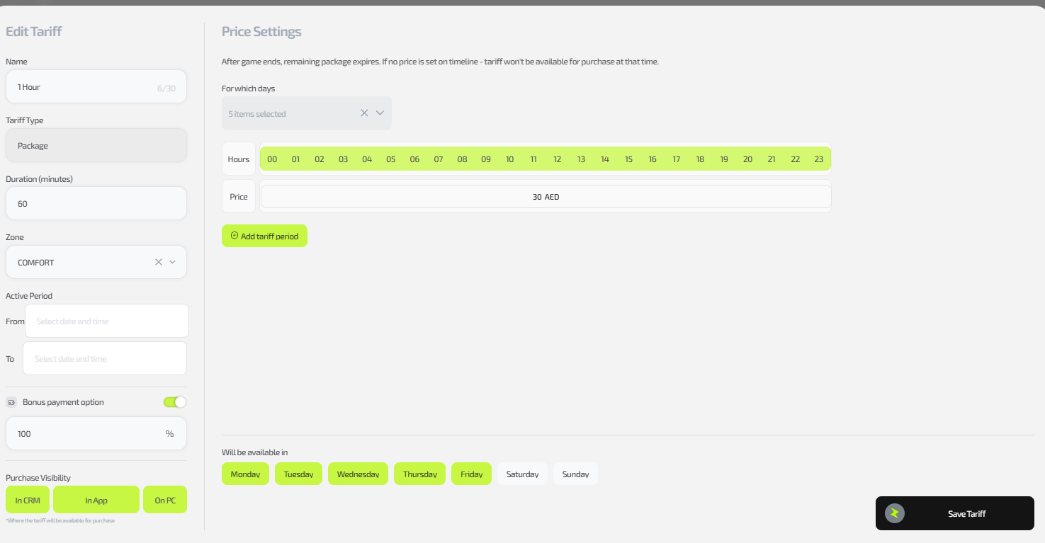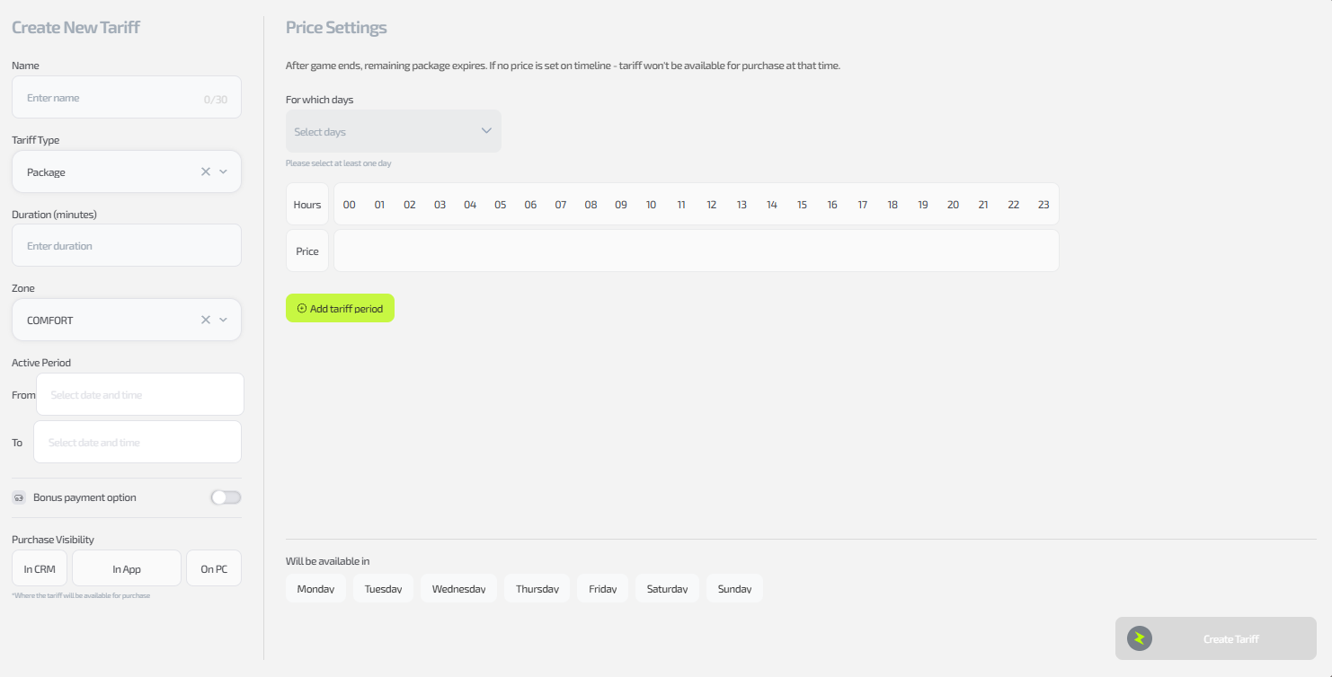 - Users with an owner account (the administrator has no rights to create/edit tariffs).