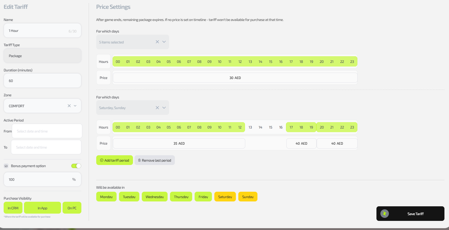 - For split periods (night: 22:00–08:00), set the price in each fragment (00–08 and 22–00)