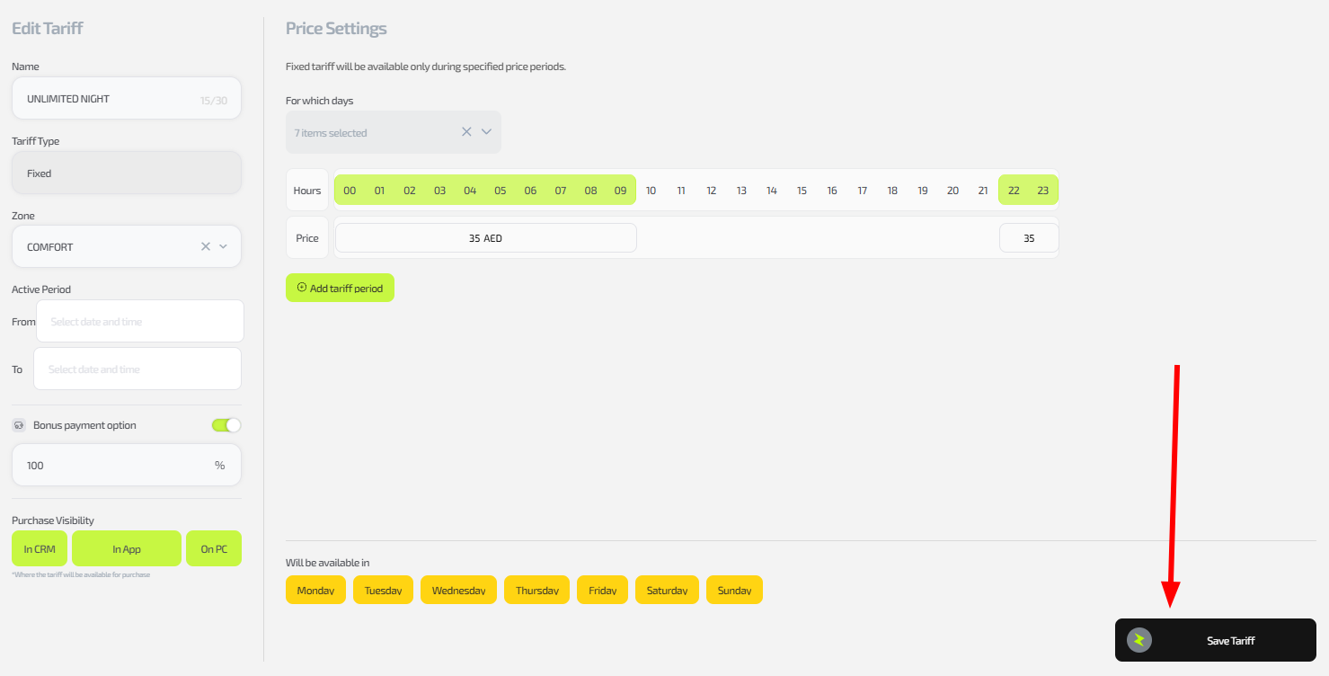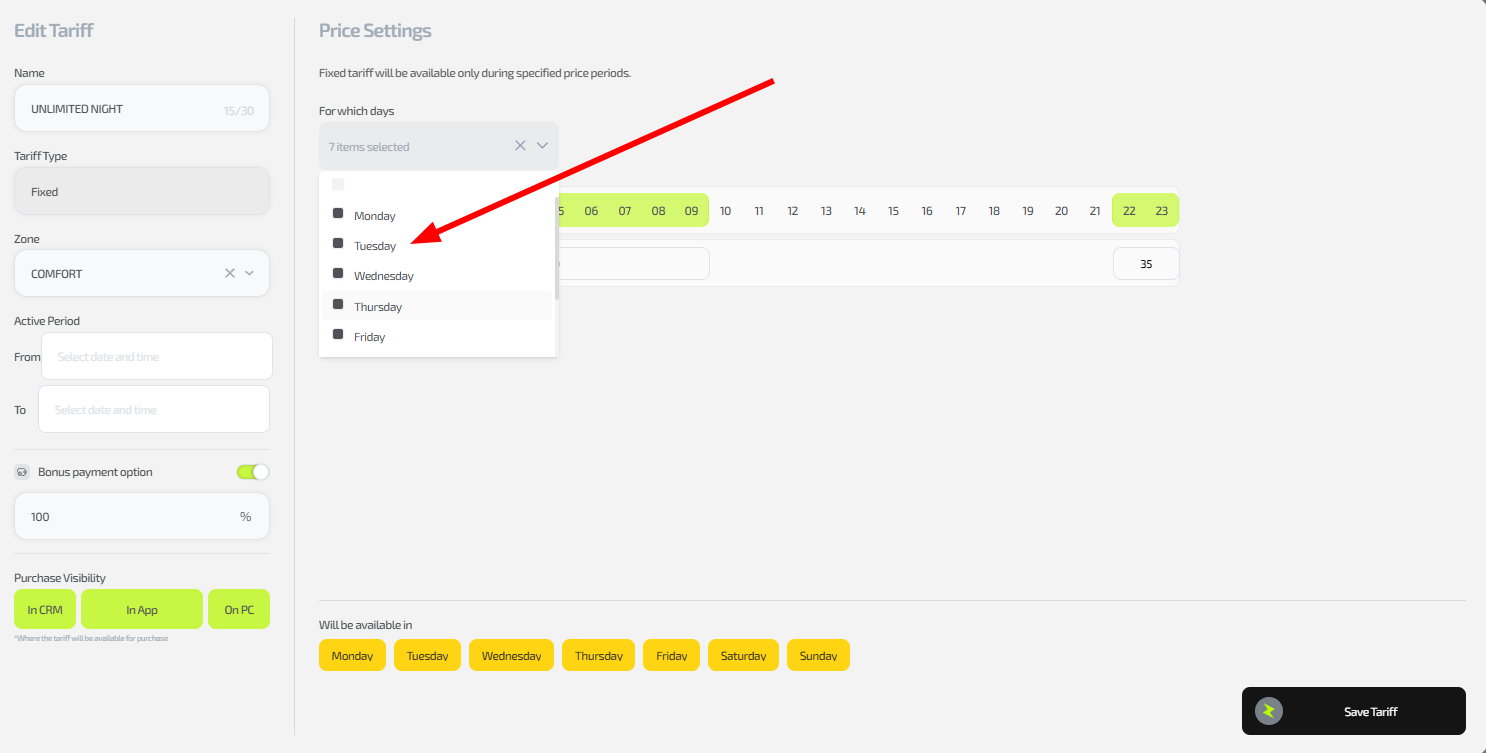 Important: Each day of the week can be selected only in one period — duplicates are not allowed. If you configure several tariffs, repeat this process for each one separately.