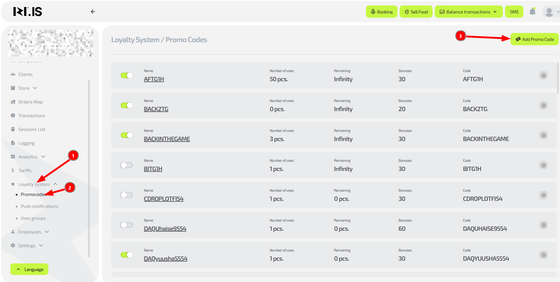 Why this is needed: To launch a marketing campaign that will attract new clients or reward regular ones. For example, you can create the promo code “WELCOME100” to credit 100 bonus points to all new clients.