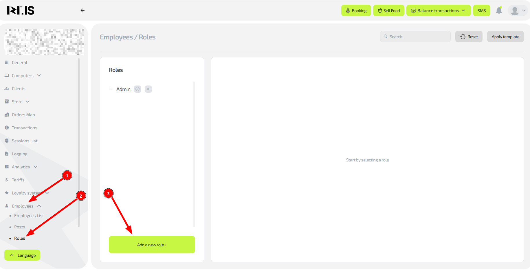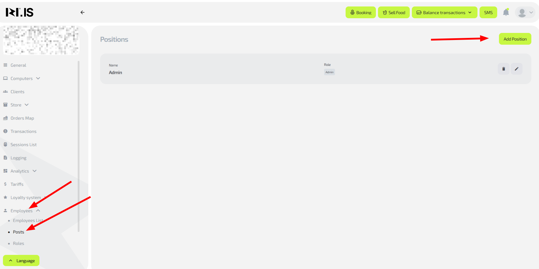 Show the club manager how to add staff members to the system, assign them positions, and configure access rights using the role system.
