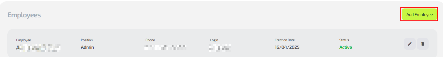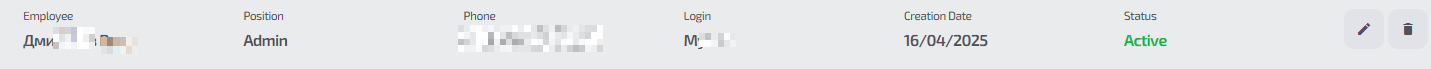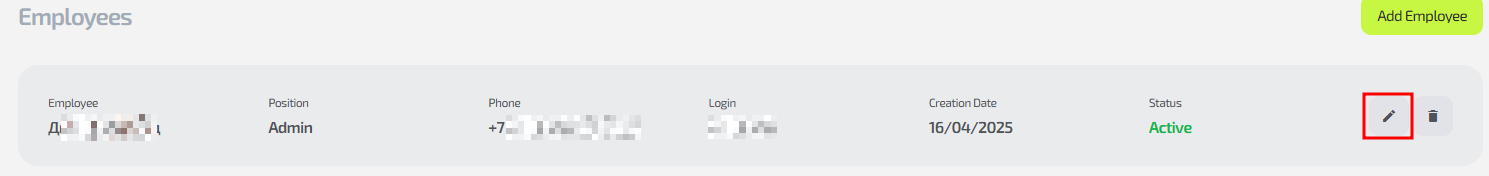 - In the required employee’s row click the pencil icon — an additional window with account information will open