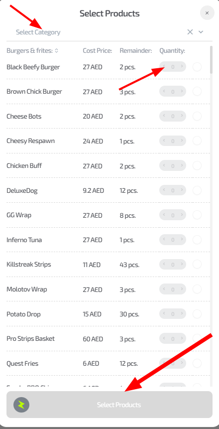 2. In the window that opens, select items from the list and specify the quantity to be written off.