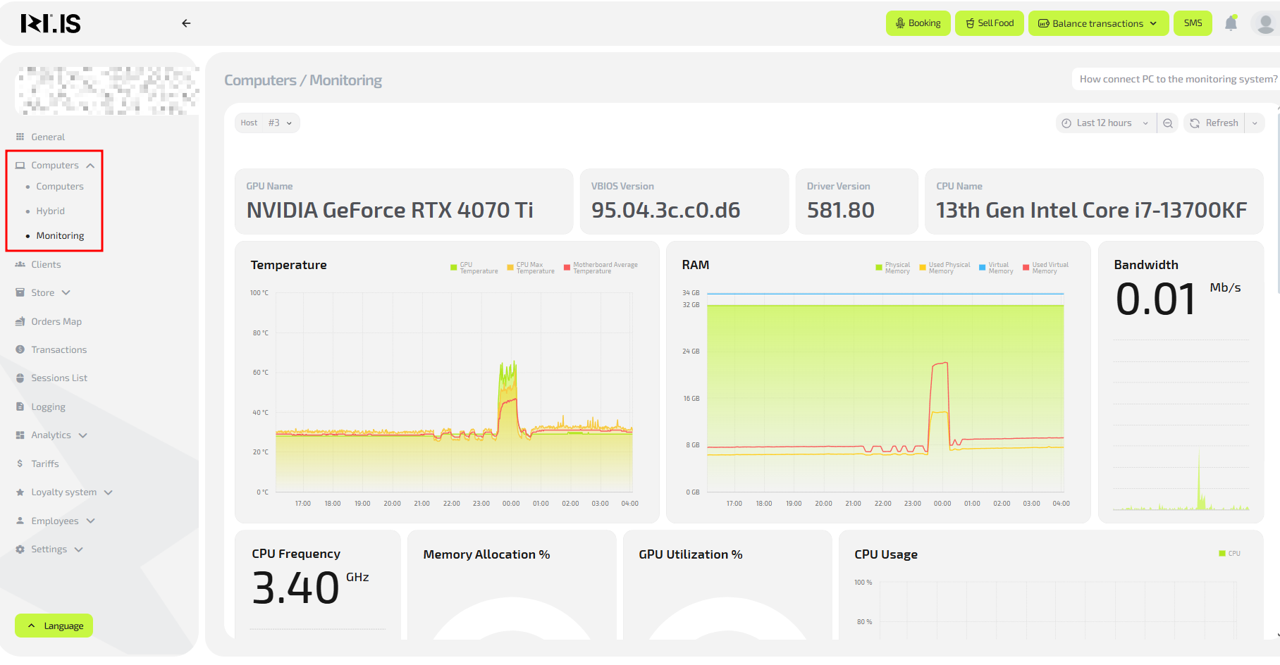 Show how to use the “Monitoring” section in IZI CRM to track the state of gaming computers, analyze their operation, and prevent technical failures.