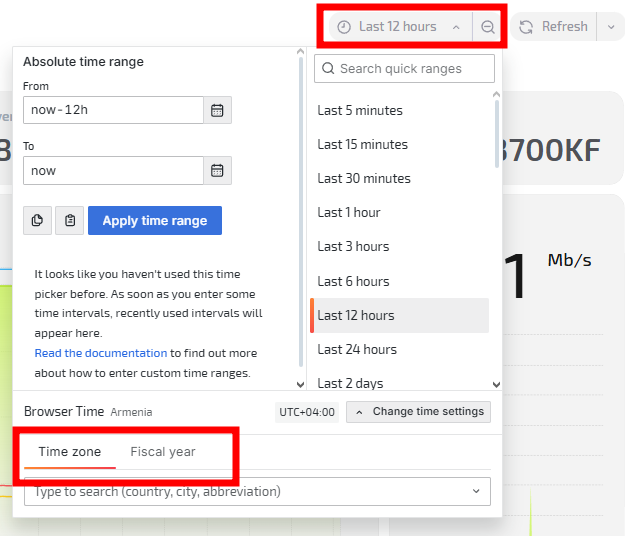 • Time interval — last 1 hour, 12 hours, day, week or a custom range;