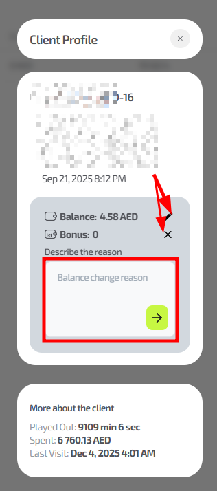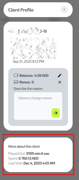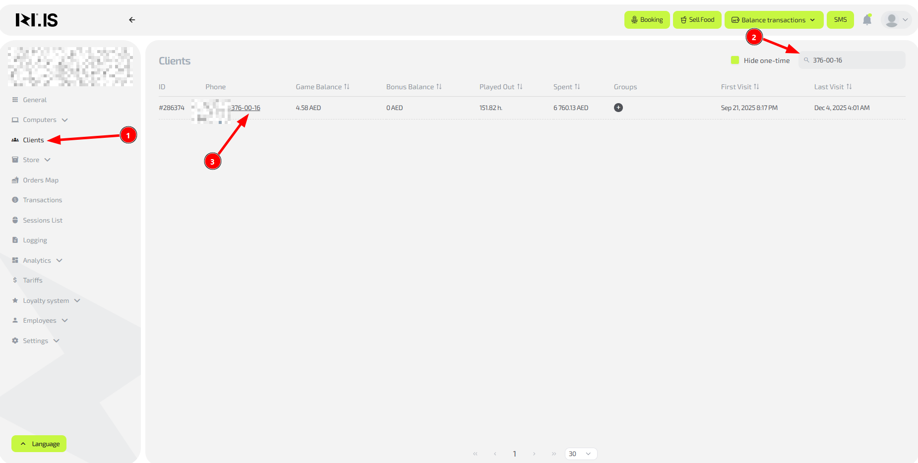 Why this is needed: To quickly access the client card for balance top-up, checking statistics, or resolving disputes. For example, when a client says “I topped up, but the money didn’t arrive”, you can instantly check their balance.
