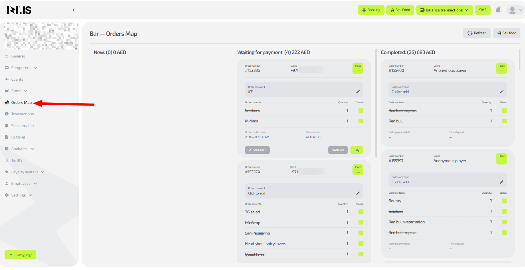 Show how the club owner can use the “Orders map” section to control revenue, analyze the load of the bar and gaming seats, and detect issues in staff performance and sales processes.