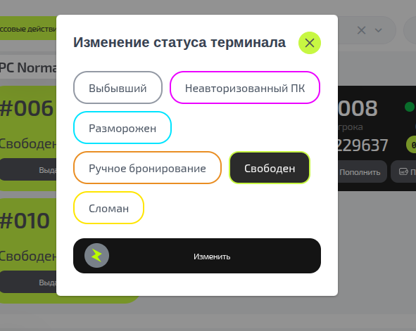 Клиент жалуется, что не видит компьютер в приложенииПроверьте статус в разделе «Компьютеры». Если ПК в статусе «Сломан» или «Разморожен» — объясните клиенту, что этот компьютер временно недоступен для бронирования.