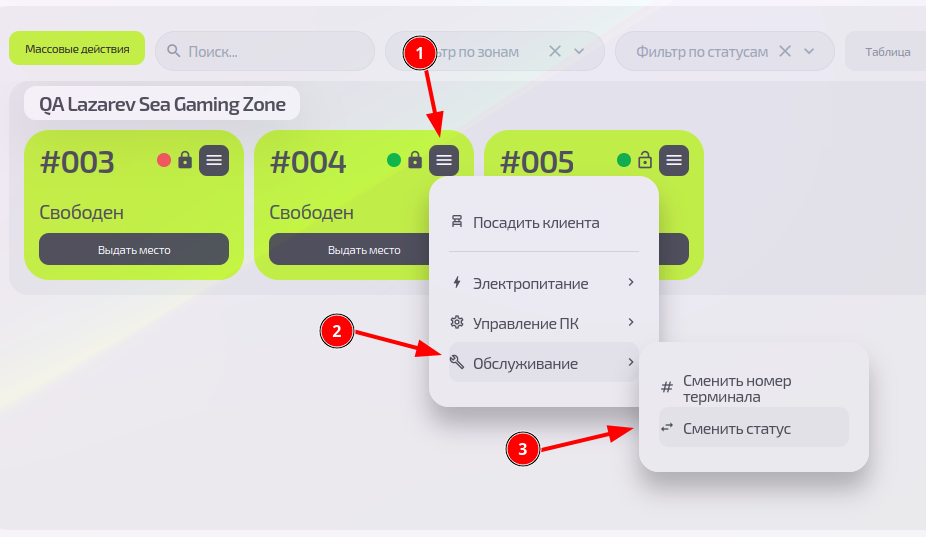 • Как статус влияет на бронирование — только «Свободные» ПК видны клиентам в приложении.