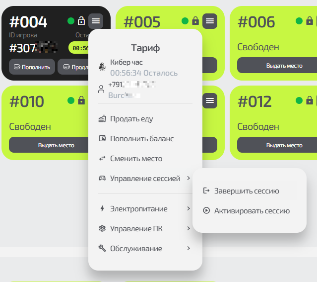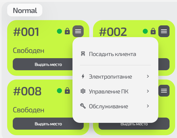 - Сменить место — пересадка клиента на другой ПК в той же зоне;