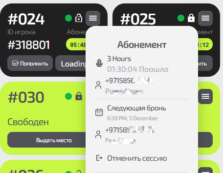 Время до окончания сессии и начала следующей (если следом за текущей сессией кто-то уже забронировал другую) или кнопка «Продлить» (продление текущей сессии с выбором пакета продления и его оплатой). Если за текущей сессией есть следующая бронь, то в меню карточки отобразится информация о следующей сессии.