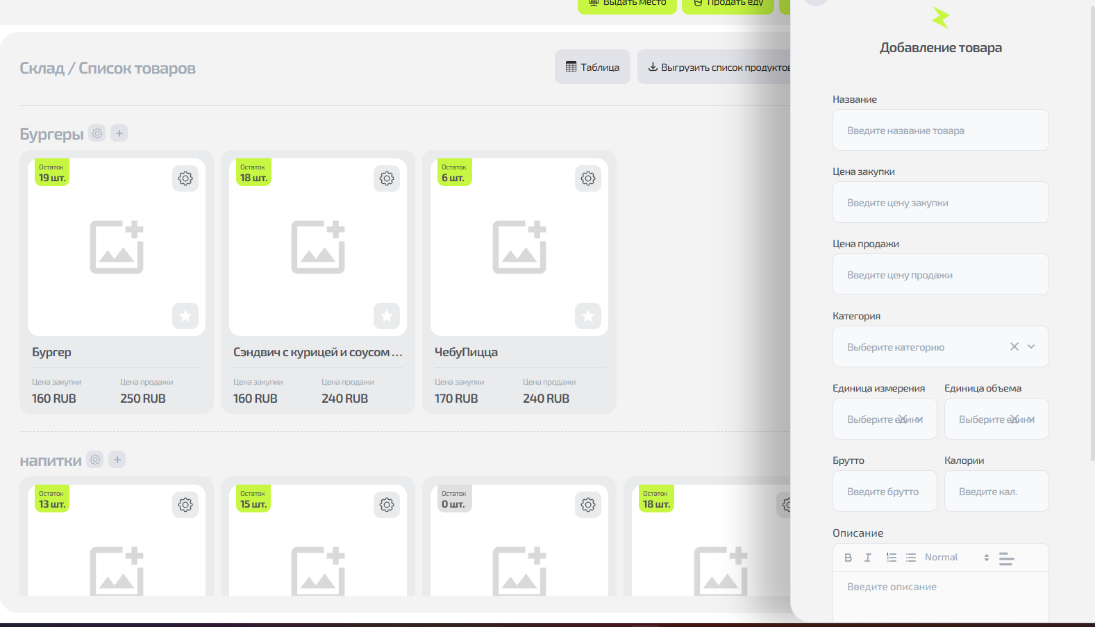 Перед добавлением товаров создайте для них категории (например, «Напитки», «Закуски»).