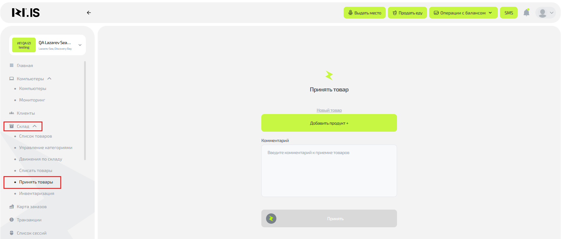 1. Перейдите в подраздел «Принять товар» раздела «Склад».