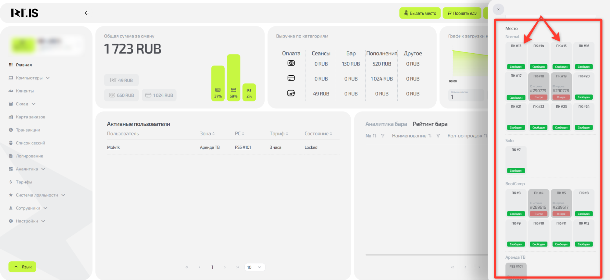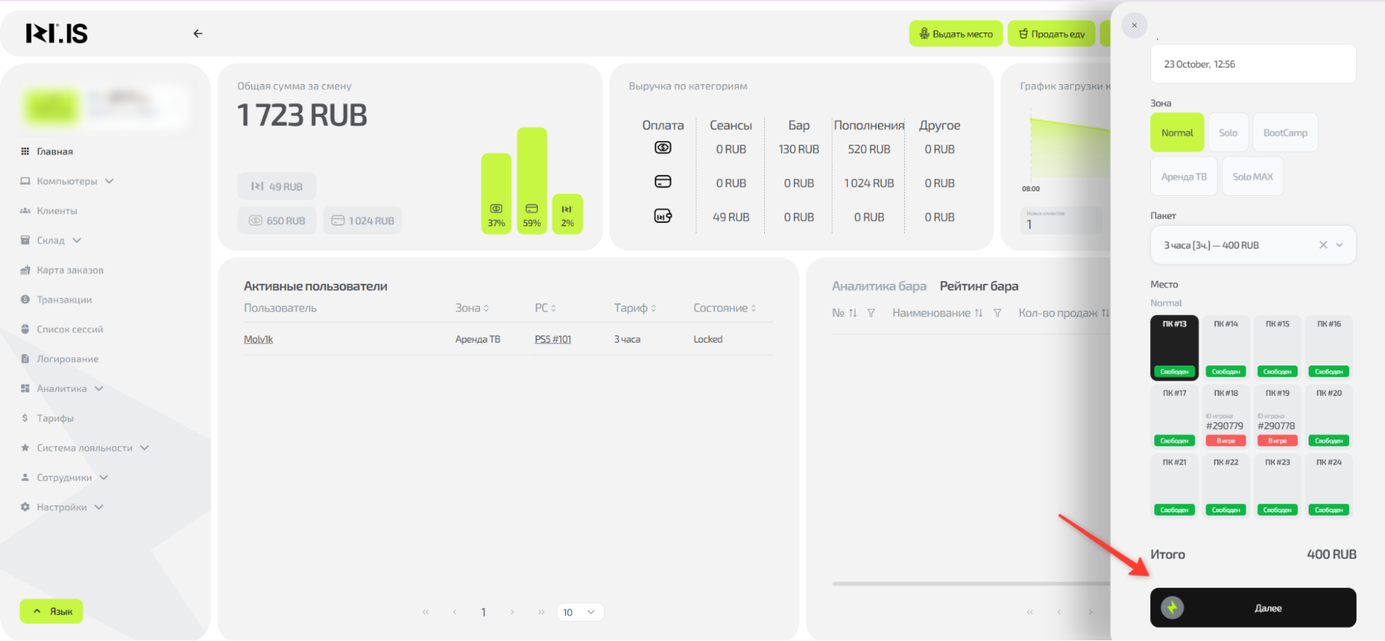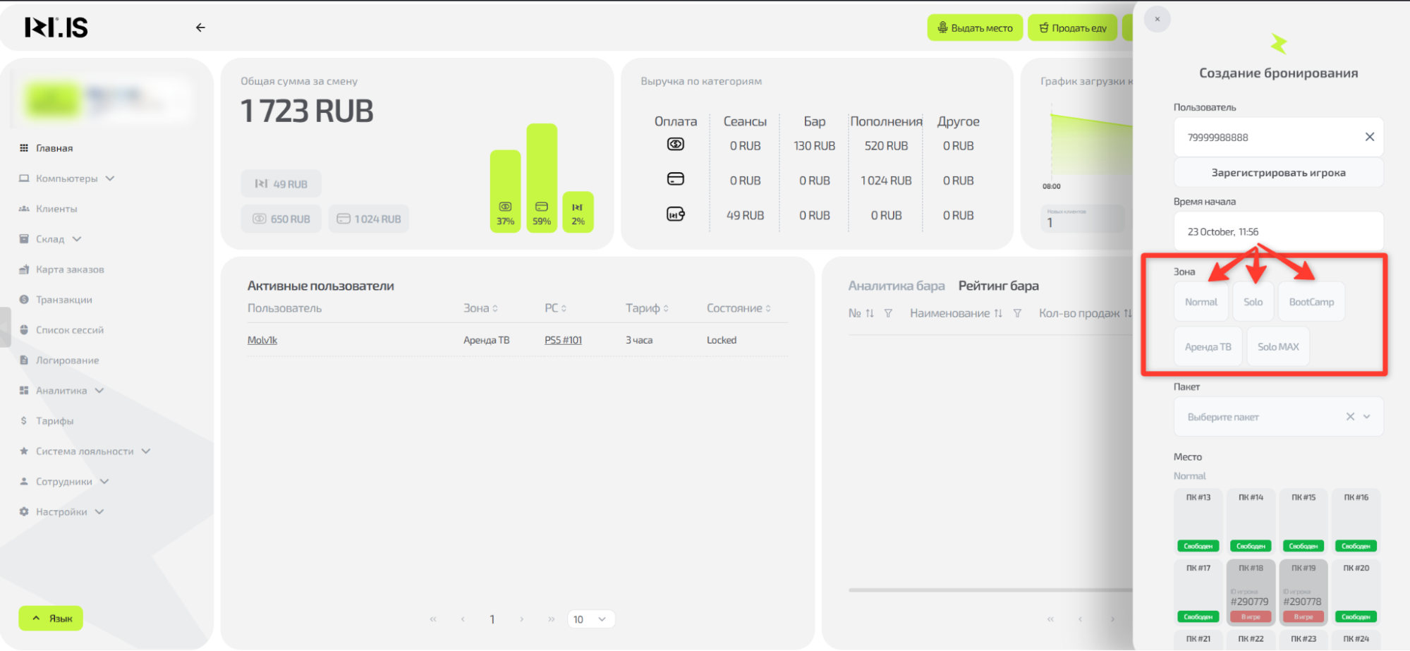 Понять логику процесса выдачи места и выполнить его от выбора клиента до приема оплаты. Это ключевой процесс, с которого начинается любая игровая сессия и формируется заказ.