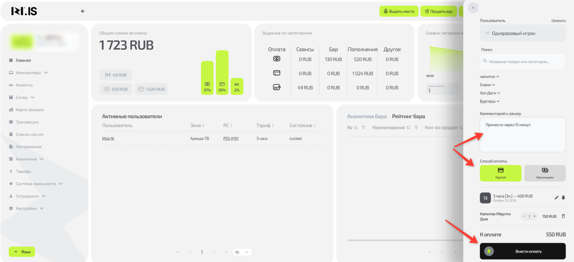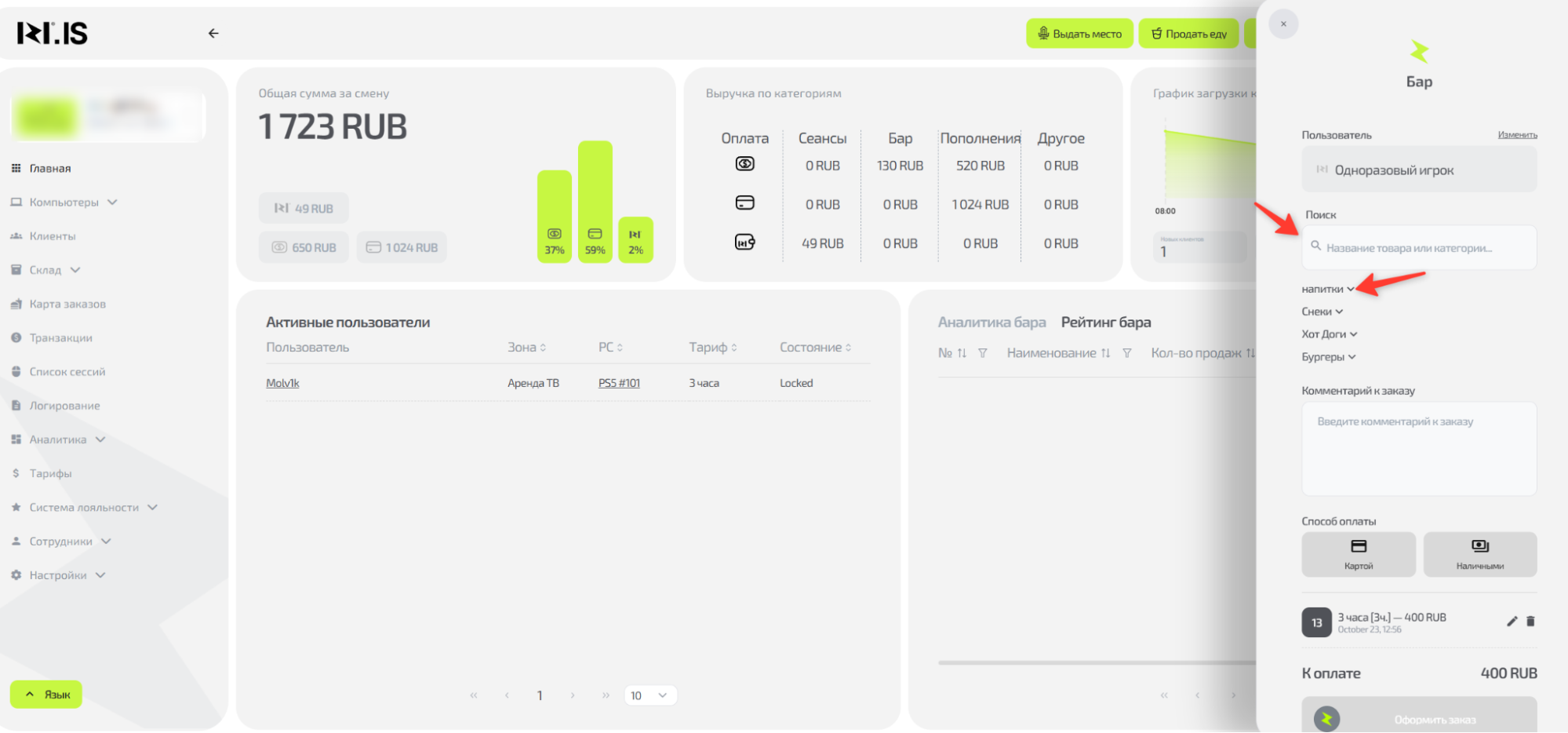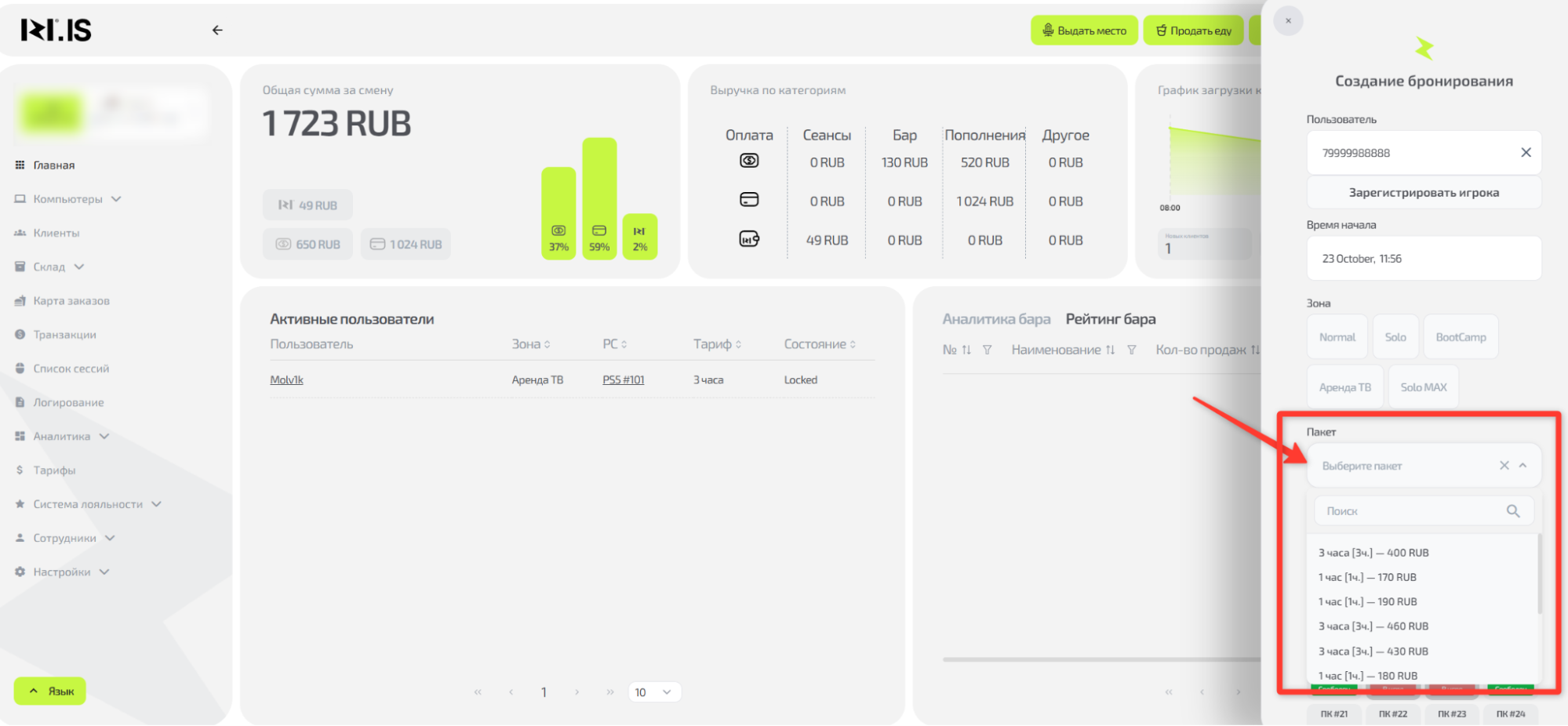 • В системе настроены тарифы, пакеты и товары из бара.
