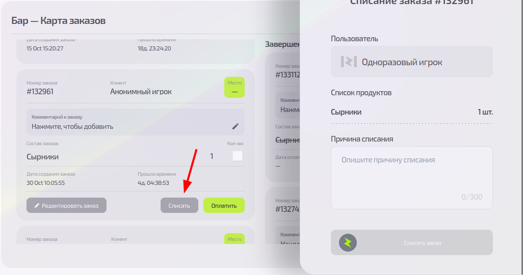 | Клиент передумал брать товар | Нажмите «Списание» для отмены |
