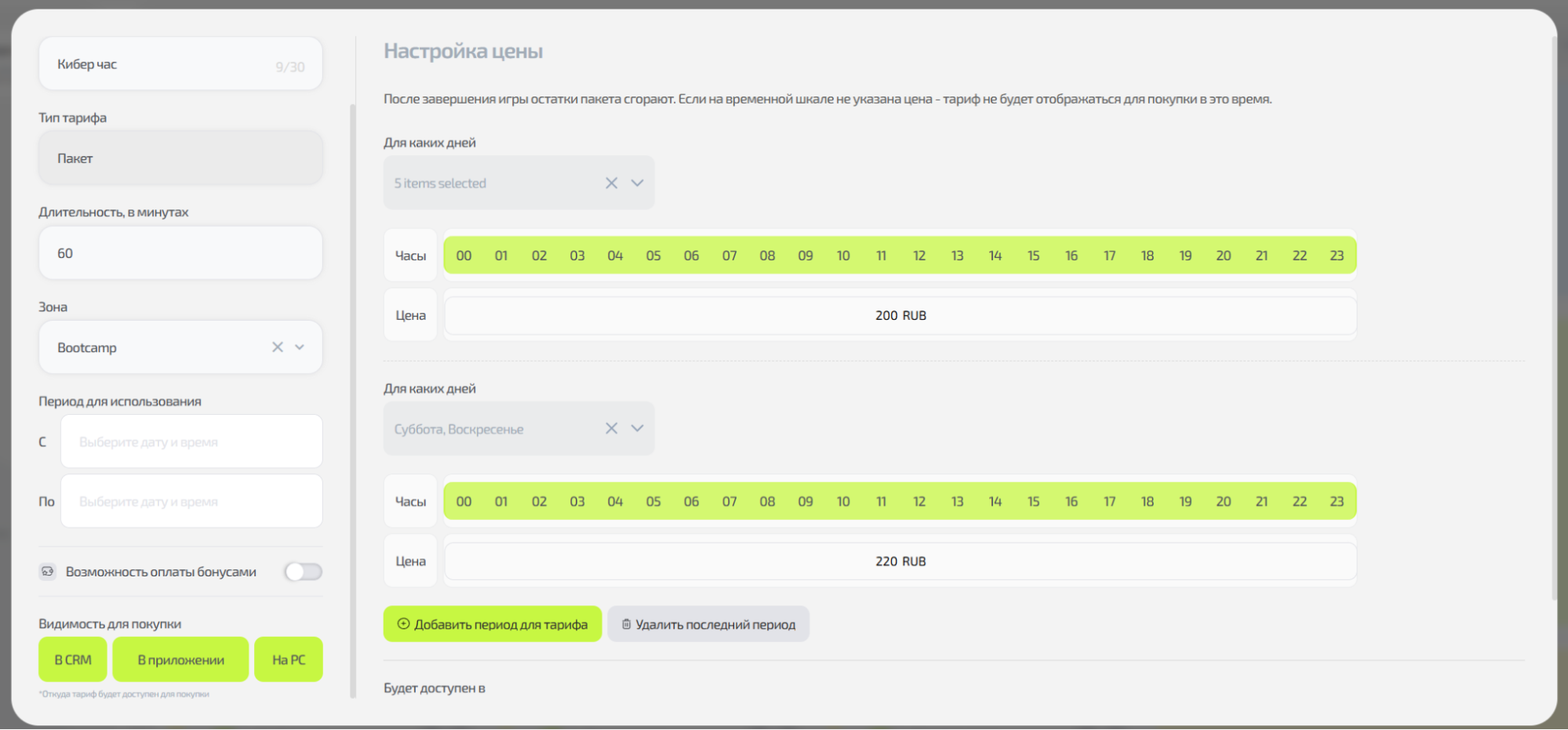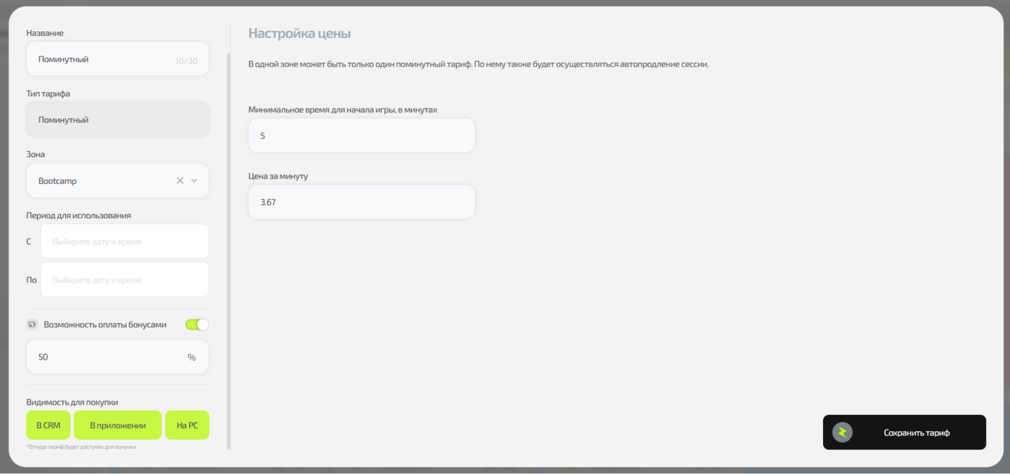 • Указывается цена за час, на её основе автоматически рассчитывается стоимость минуты