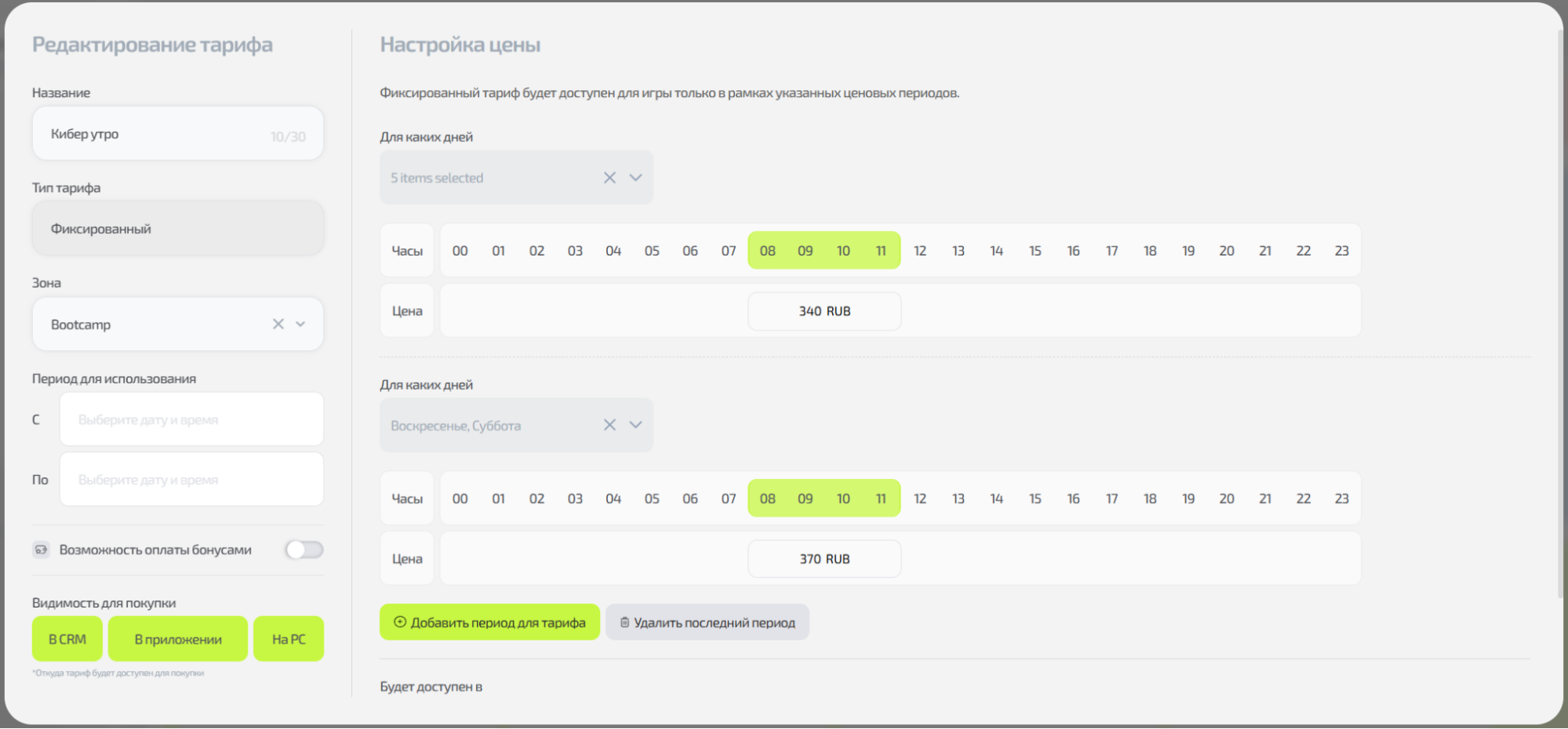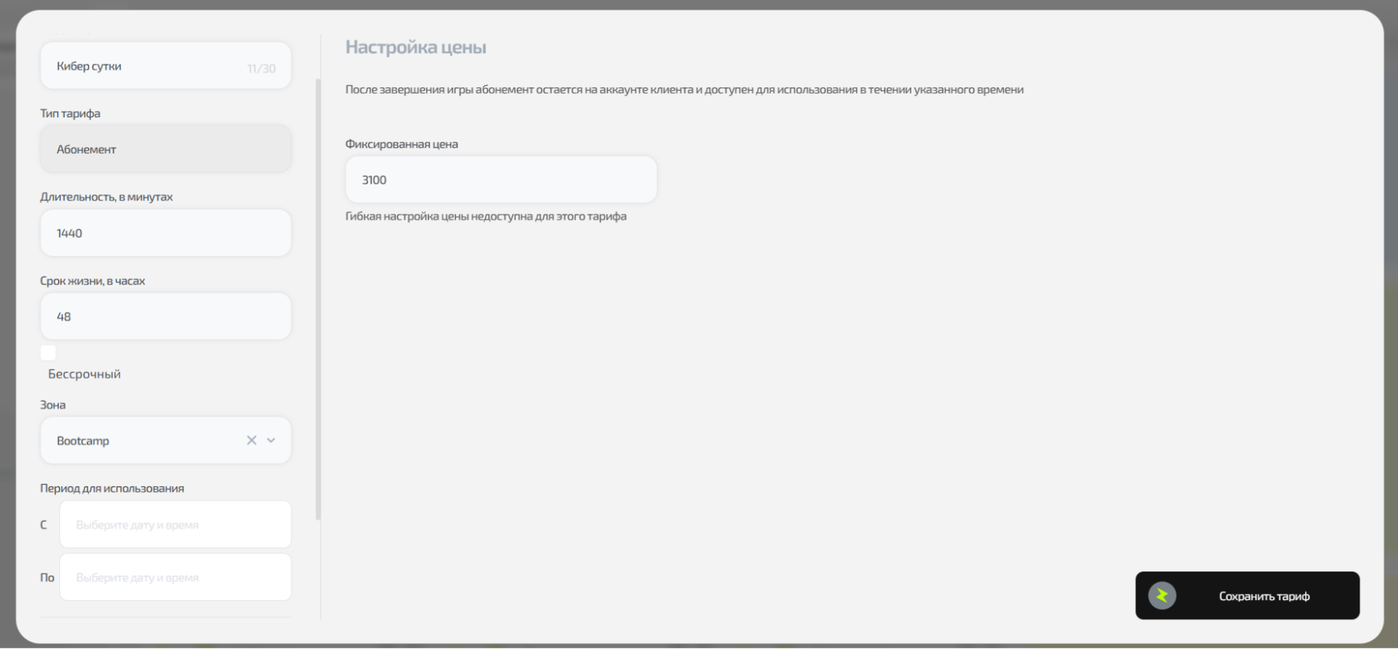 ⚠️ Важно: создание и редактирование тарифов недоступно под учётной записью администратора — только под владельцем.