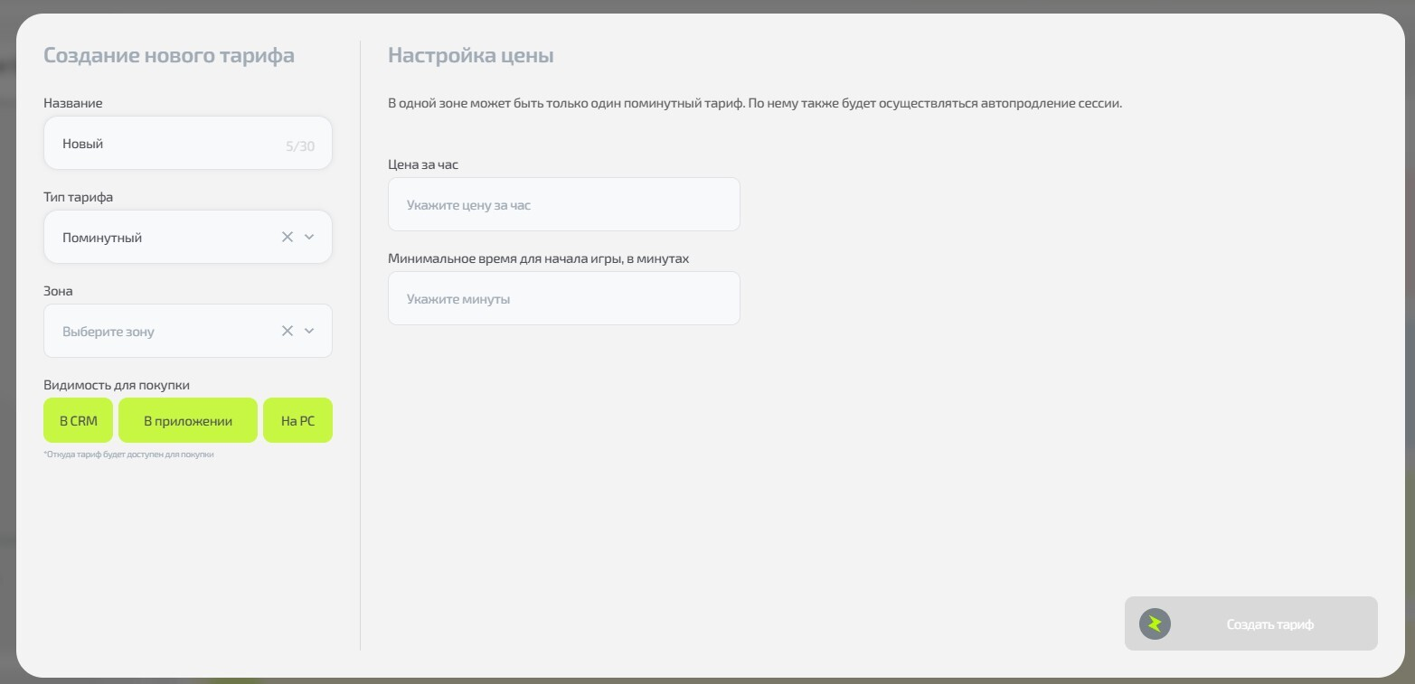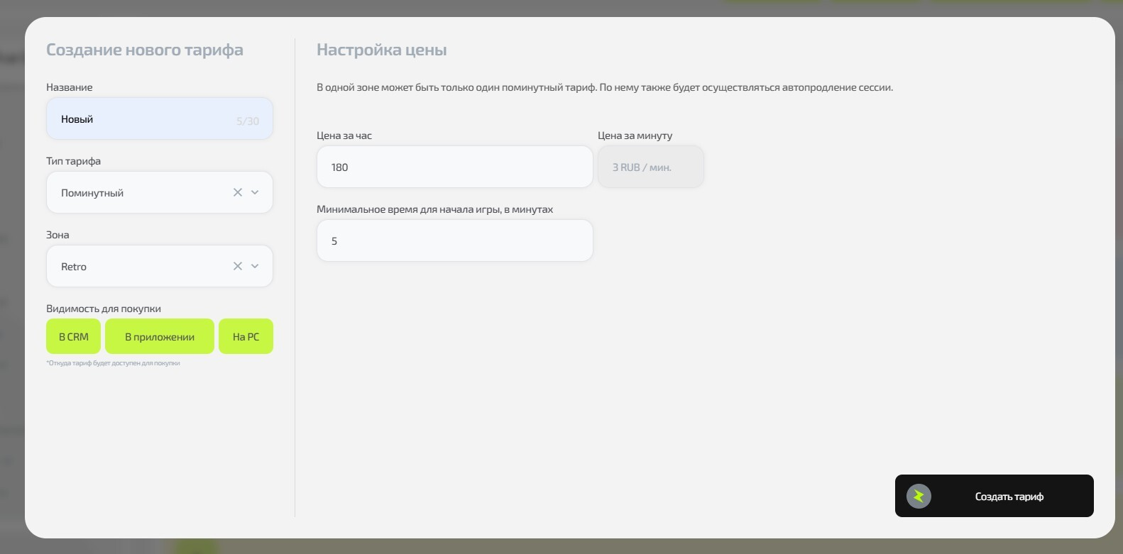 ⚠️ Для каждой зоны ПК может существовать только один активный поминутный тариф, именно он используется системой для автопродления.