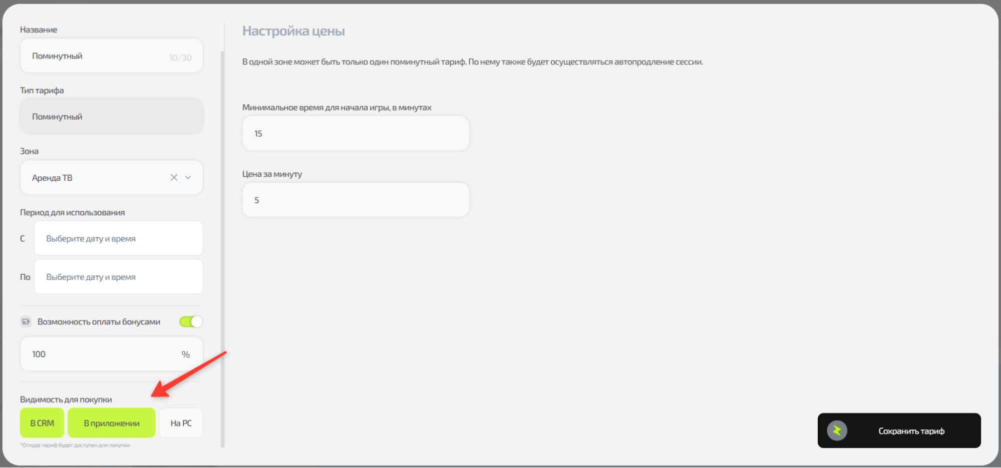 - Нажмите "Сохранить тариф".