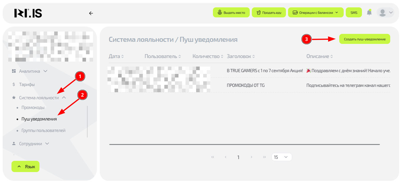 - Перейдите в раздел «Система лояльности» → «Пуш-уведомления»