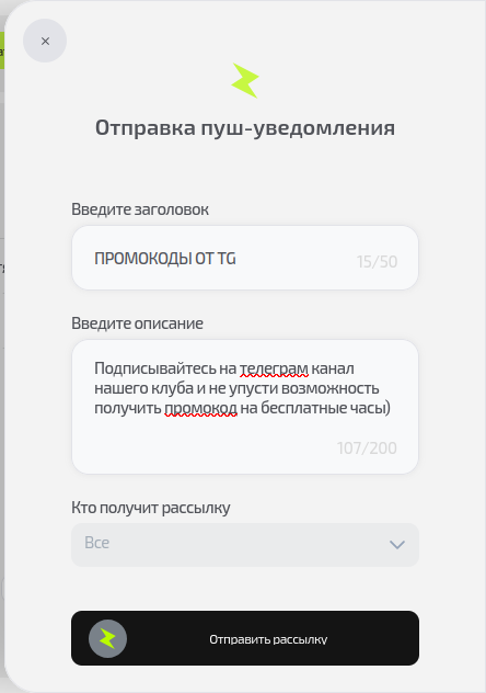 Зачем это нужно: Чтобы быстро проинформировать всех клиентов о важных событиях: открытии новой зоны, специальных акциях или технических работах. Например, уведомление о "Счастливых часах" в пятницу вечером может увеличить заполняемость в typically тихий период.