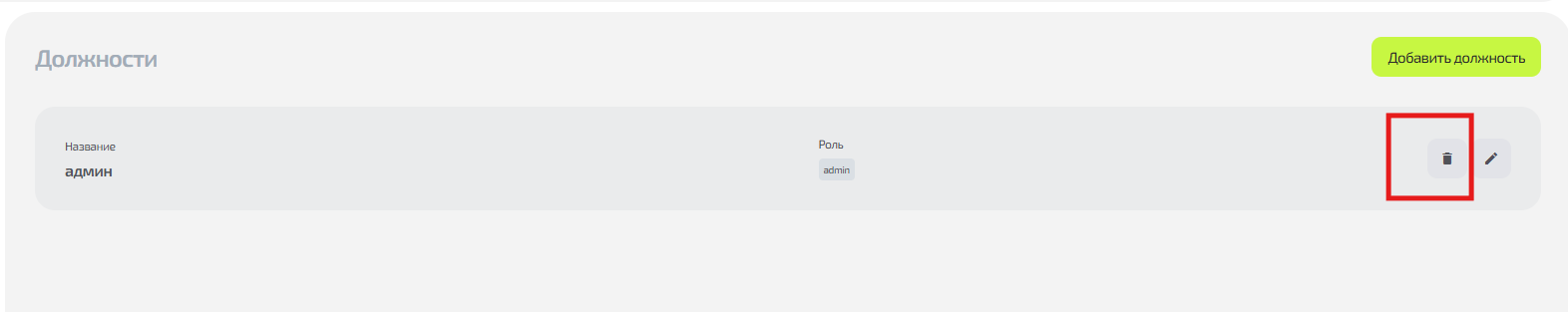 - В главном окне раздела «Должности» нажмите значок корзины напротив нужной должности.