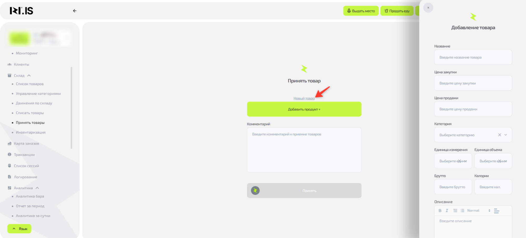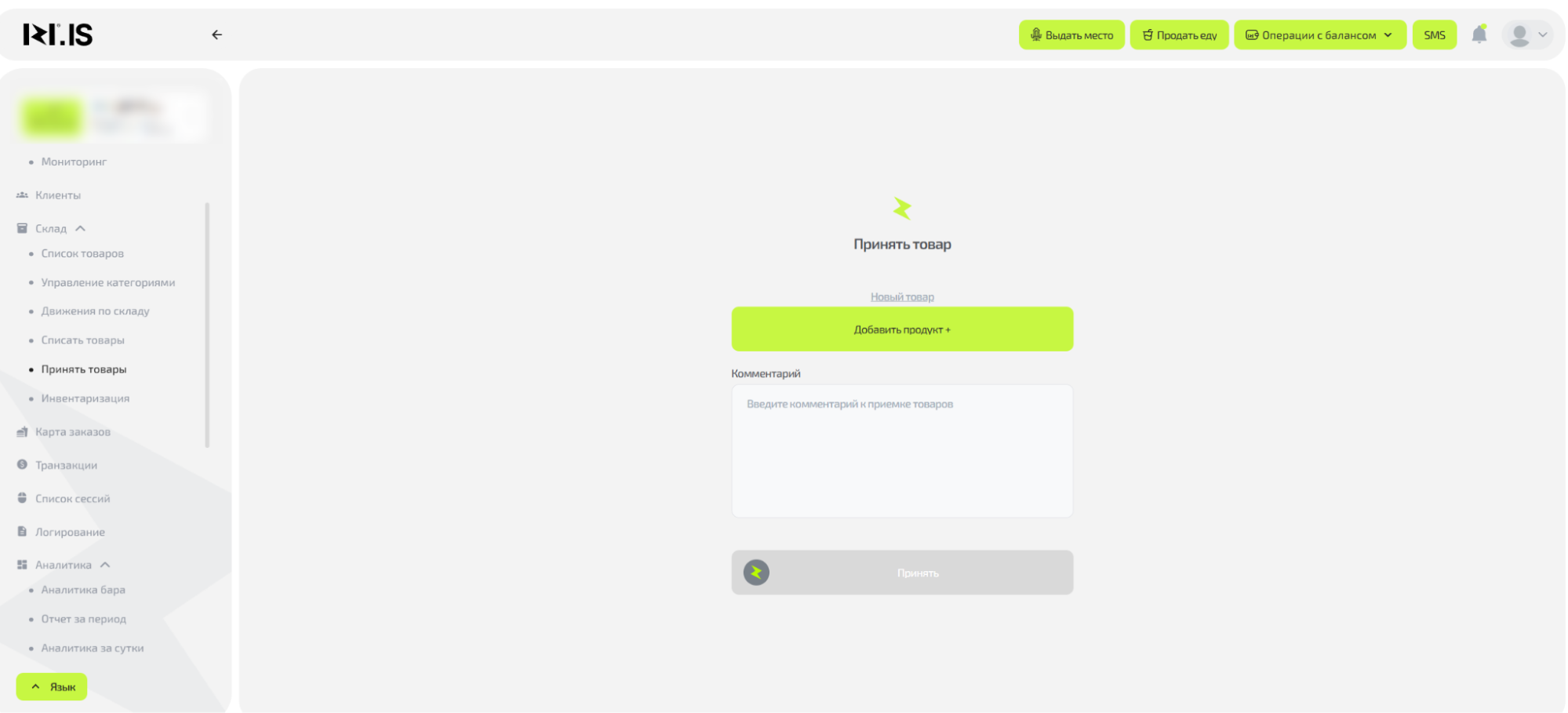 - Перейдите в раздел "Склад" → "Принятие товара".