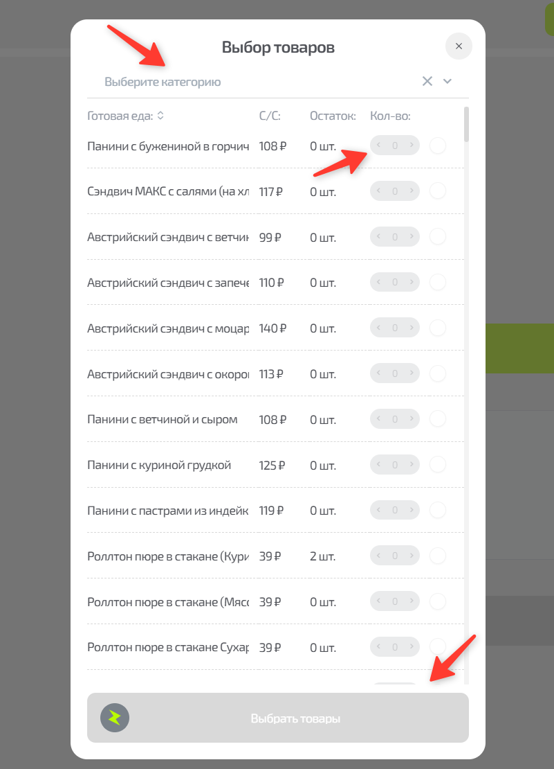 - В открывшемся окне выберите товары из списка и укажите их количество.