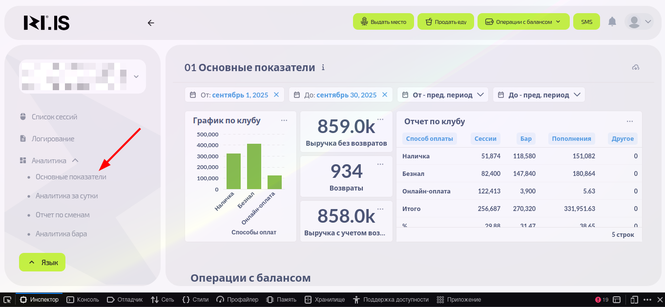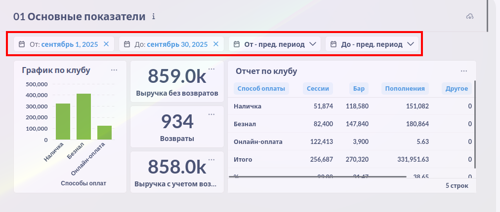 - Выручка без возвратов: Общая сумма доходов. Если есть падение, проверьте отчеты по сессиям и бару