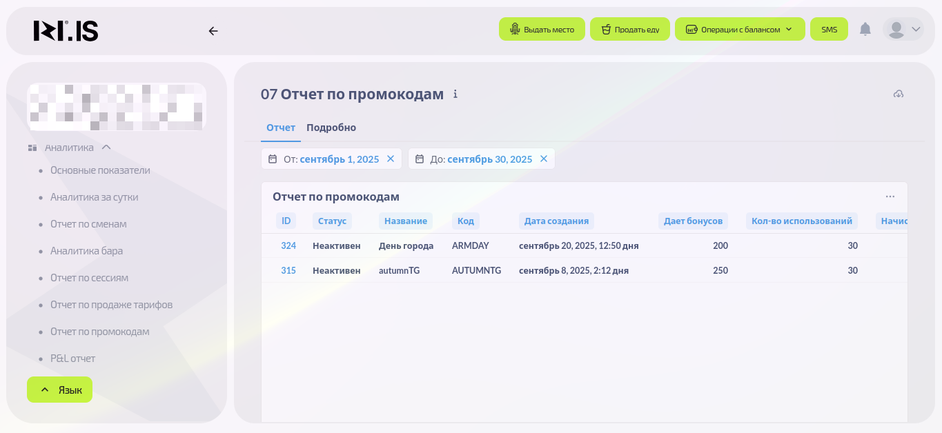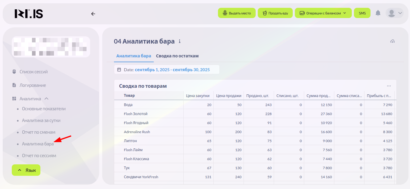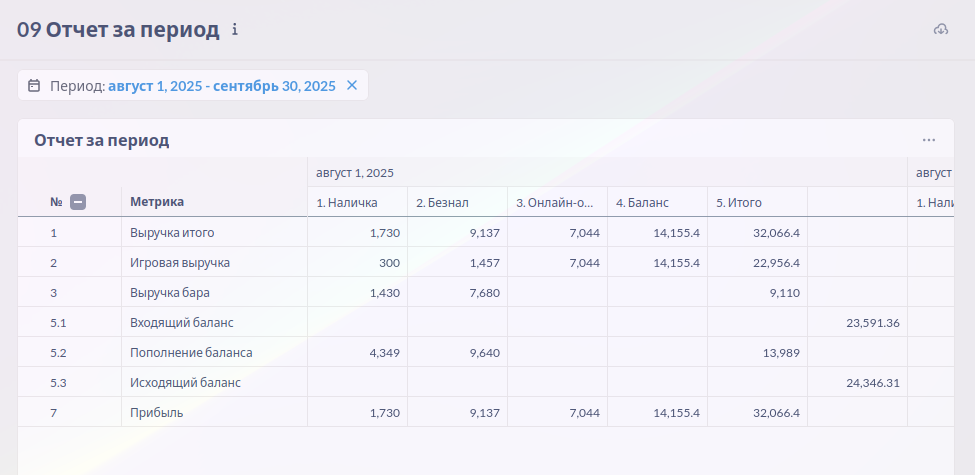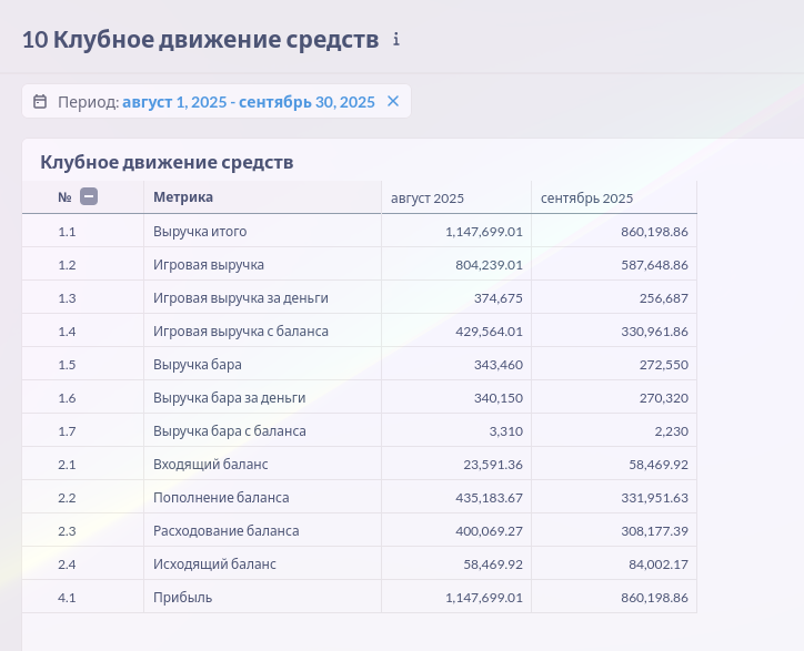 - Состав выручки: Смотрите, какие источники приносят больше (пополнения баланса, бар, тарифы). Если бар проседает — возможно, не хватает популярных товаров