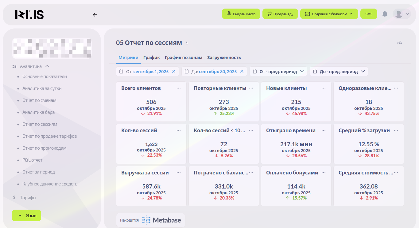| Выручка падает, но количество сессий растет | Проверьте средний чек и тарифы. Возможно, клиенты перешли на более дешевые тарифы |
