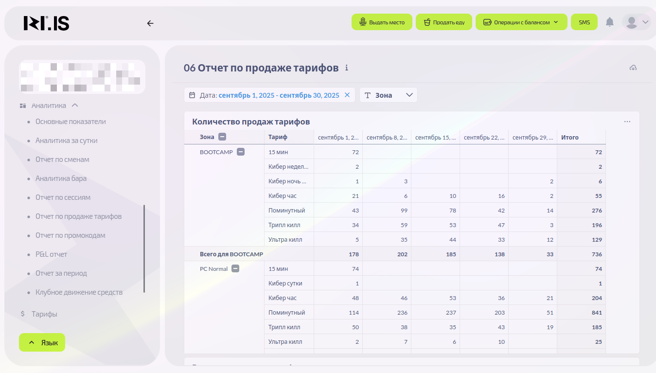 - Кол-во продаж по тарифам: Смотрите, какие тарифы покупают чаще (например, «Поминутный» или «Кибер час»)