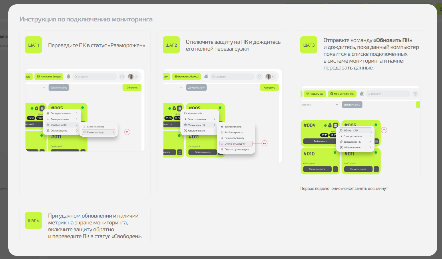 «Как подключить ПК к системе мониторинга»; - при нажатии откроется инструкция по установке и активации мониторинга для данного ПК.
