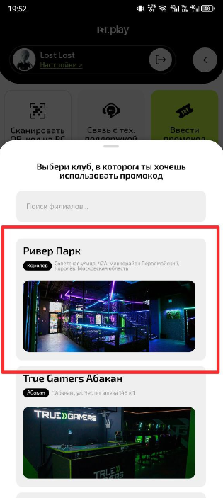 - Из списка доступных клубов выберите тот, где планируете использовать промокод