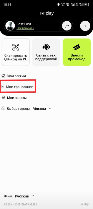 - В меню профиля найдите и нажмите на пункт "Мои транзакции"